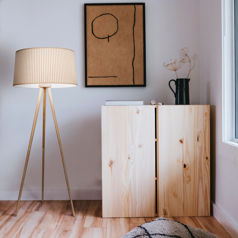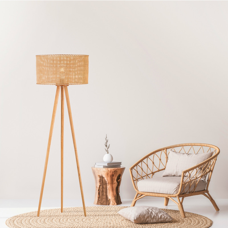 En este caso, os presentamos una lampara de pie de madera y pantalla de ratán natural. Esta pieza es perfecta para dar un toque sencillo y acogedor al salón. Gracias a su pantalla, la luz se proyecta de manera tamizada aportando calidez y confort.