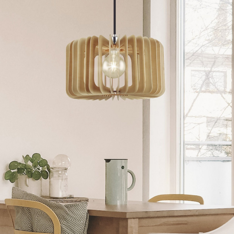 Increíble lámpara de techo colgante hecha de madera, con un acabado en color madera natural. Ligera, original y sofisticada. Utiliza una bombilla E27 y su potencia máx. es de 60w. Sus medidas (cm) son de 40x40x36.