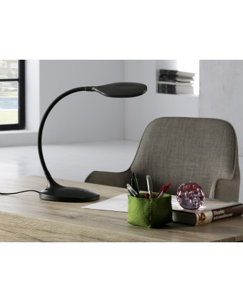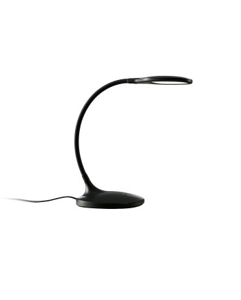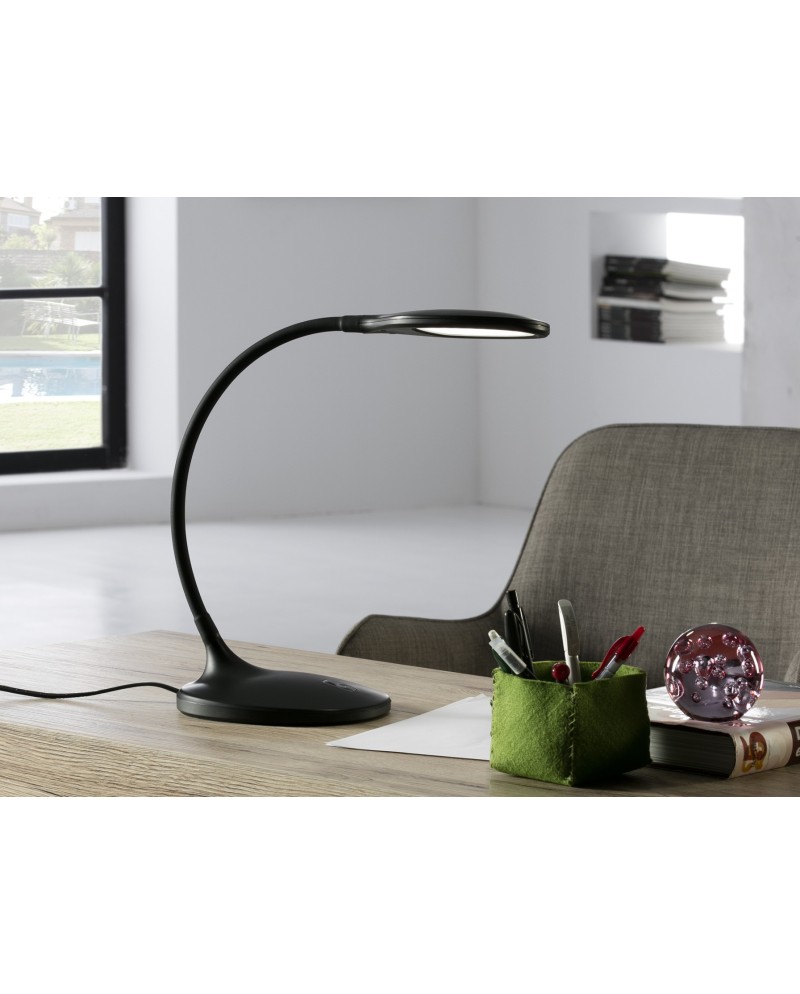 Lámpara sobremesa de estudio LED, realizada en plástico color negro mate. Brazo flexible. Intensidad regulable con pulsador táctil. 7W LED. 750 lm. 4.000 K.
